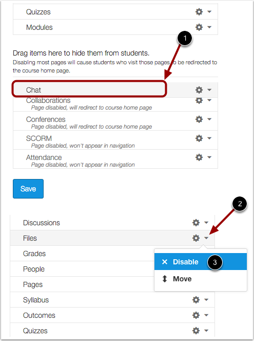 If you are using the New Canvas User Interface, reordering and hiding Course Navigation links affects the course tabs in the Dashboard course view. Learn more about the new Dashboard.