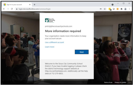 After you have entered your password, if multi-factor authentication has been turned on for your account, you will be prompted for “More information required”. Click next.