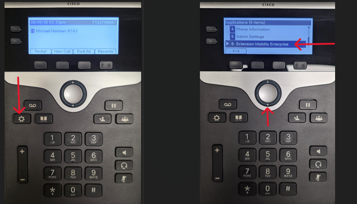 - Press the "Settings" gear on the phone. Using the Up/Down key, scroll down until you see Extension Mobility Enterprise.